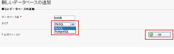 作成する「データベース名」を入力して、タイプを「MySQL」を選択します。
