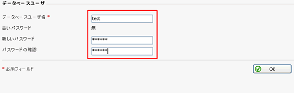 作成する「データベースユーザ名」と「パスワード」を入力して、「OK」ボタンをクリックします。